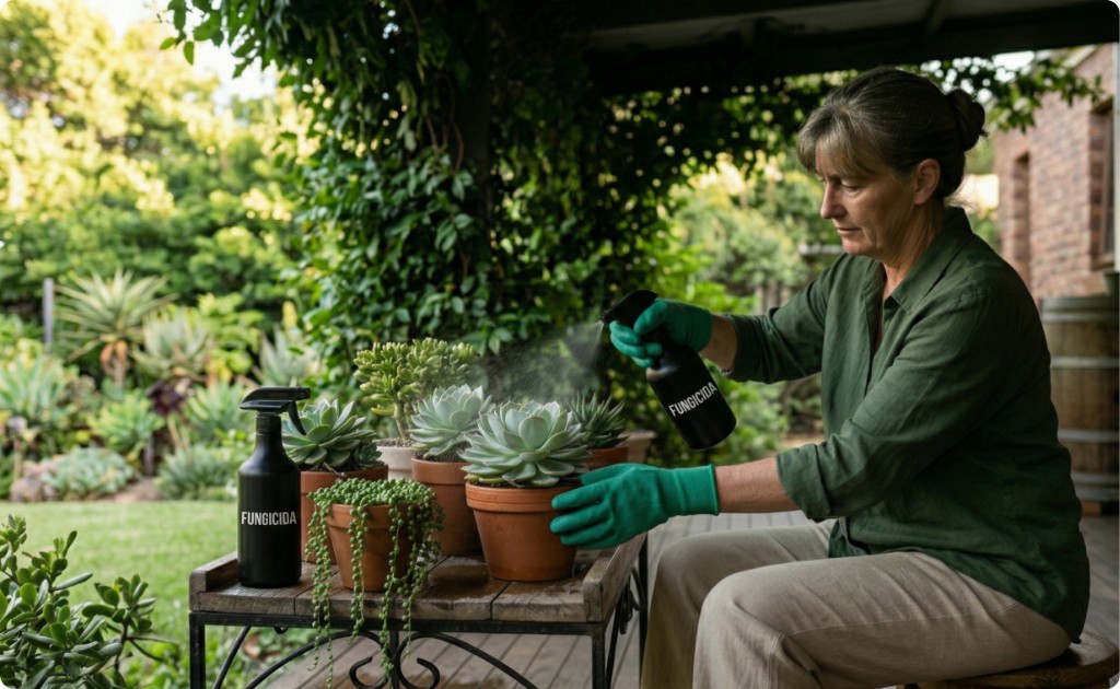 A Regra da Sombra (Crucial): Nunca, jamais, aplique qualquer produto sob o sol forte. O líquido nas folhas, em contato com o sol, funciona como uma lupa e vai causar queimaduras graves na sua suculenta. Aplique sempre no final da tarde, quando o sol já se foi.
